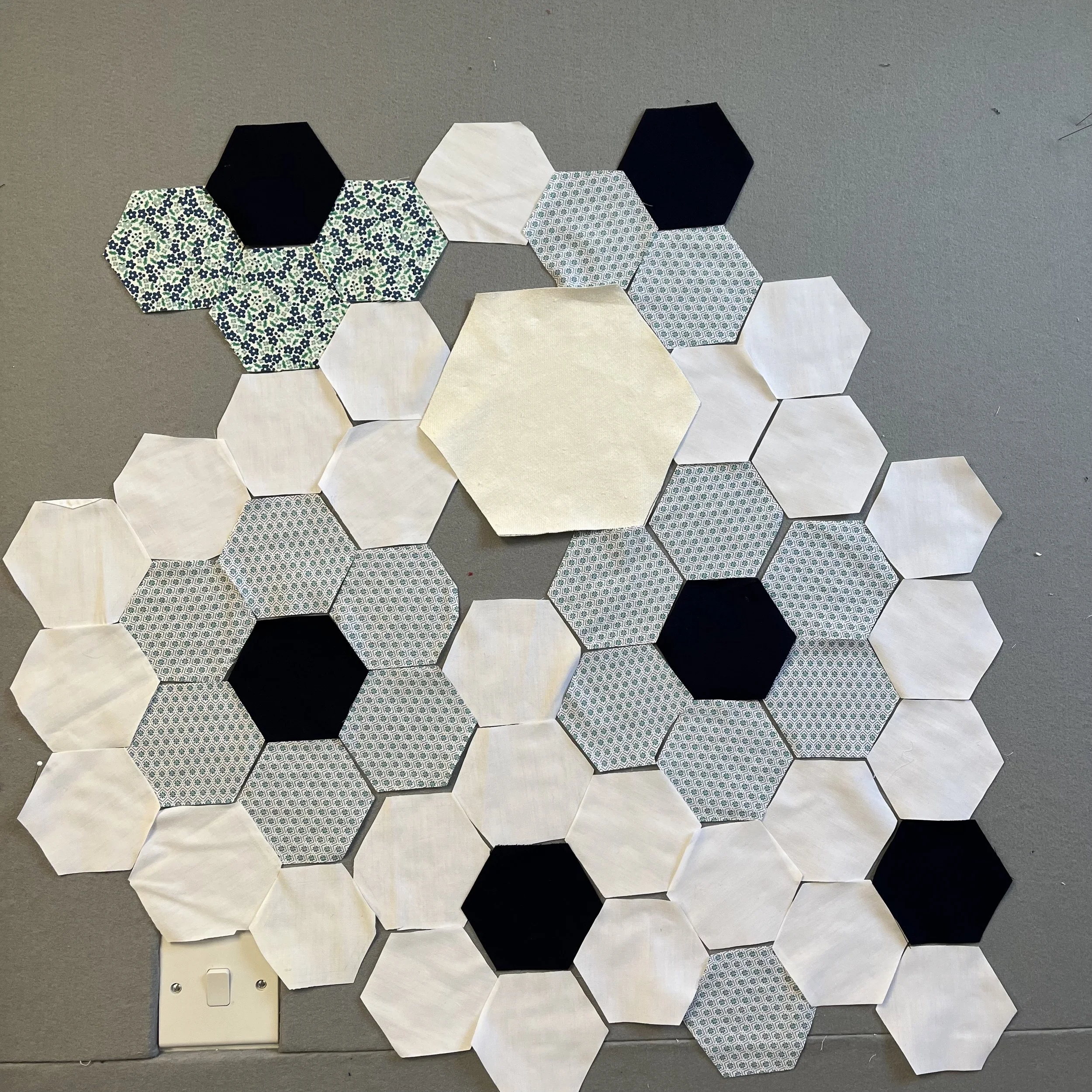 There is not much that communicates welcome and comfort better than a patchwork quilt. A Grandmother’s flower garden quilt is instantly recognisable as quilt from a distance. So i began to collect cotton shirts that were not longer being worn, and used the fabric to make many hexagons. And put those on my design wall.